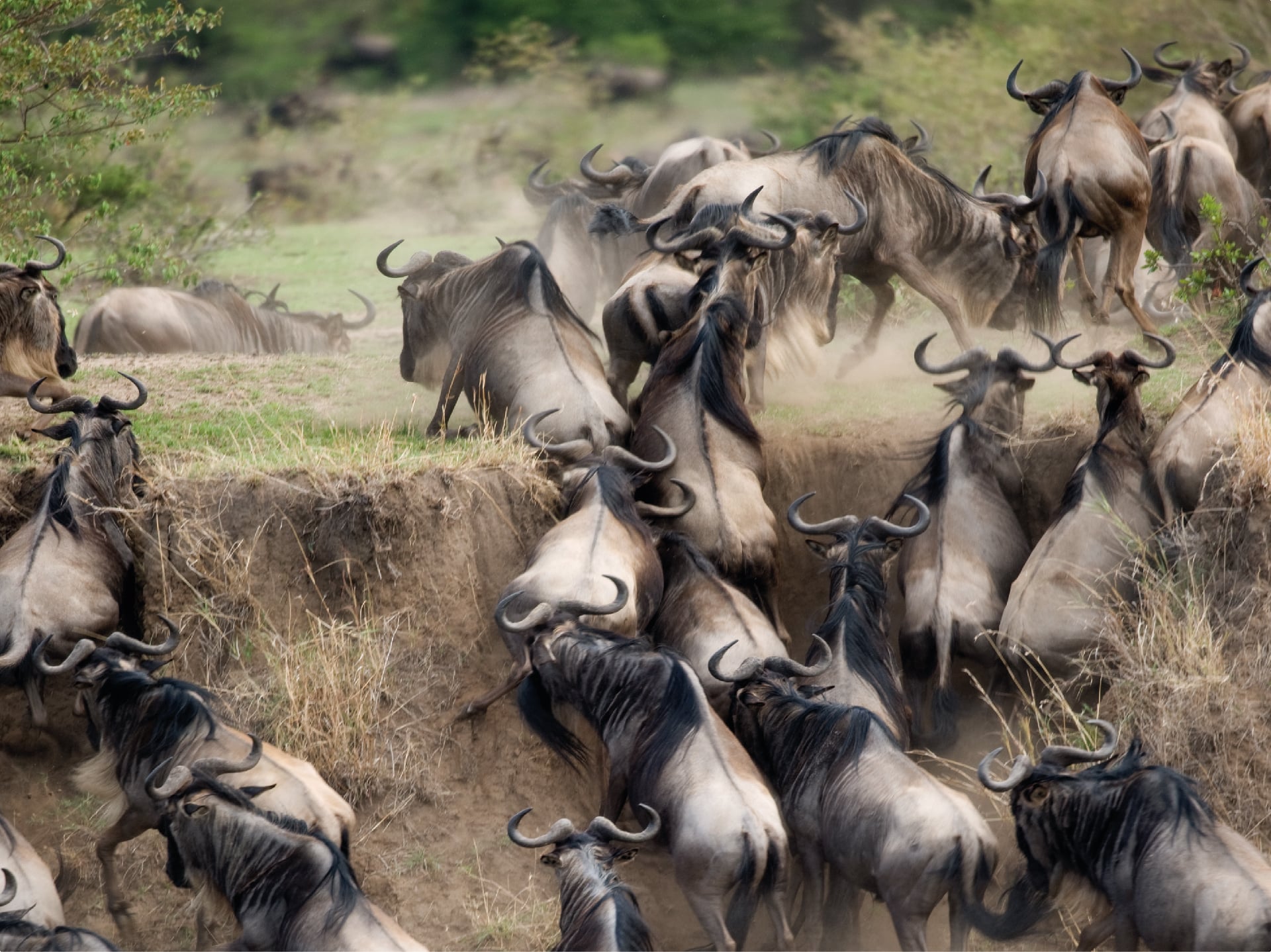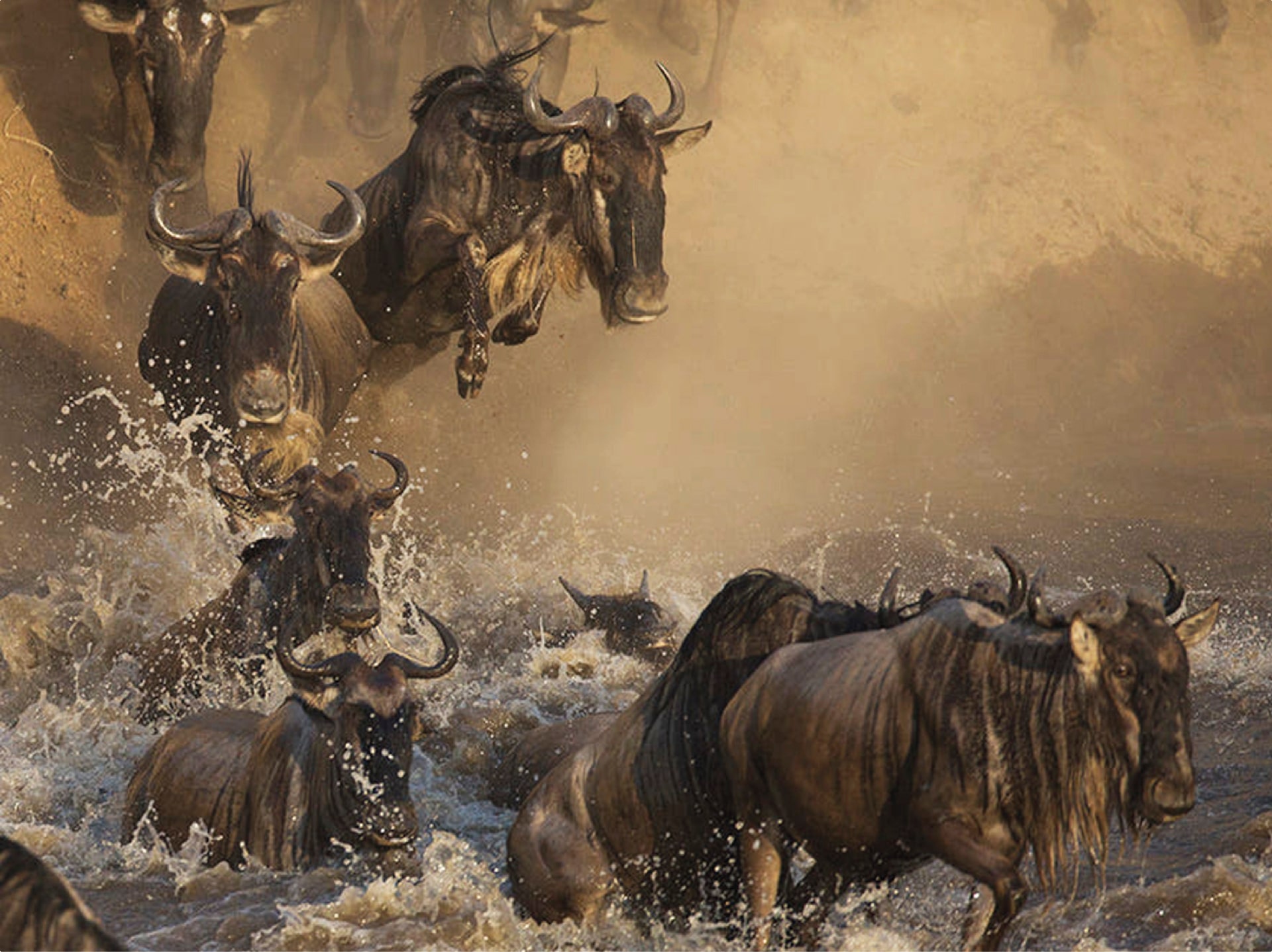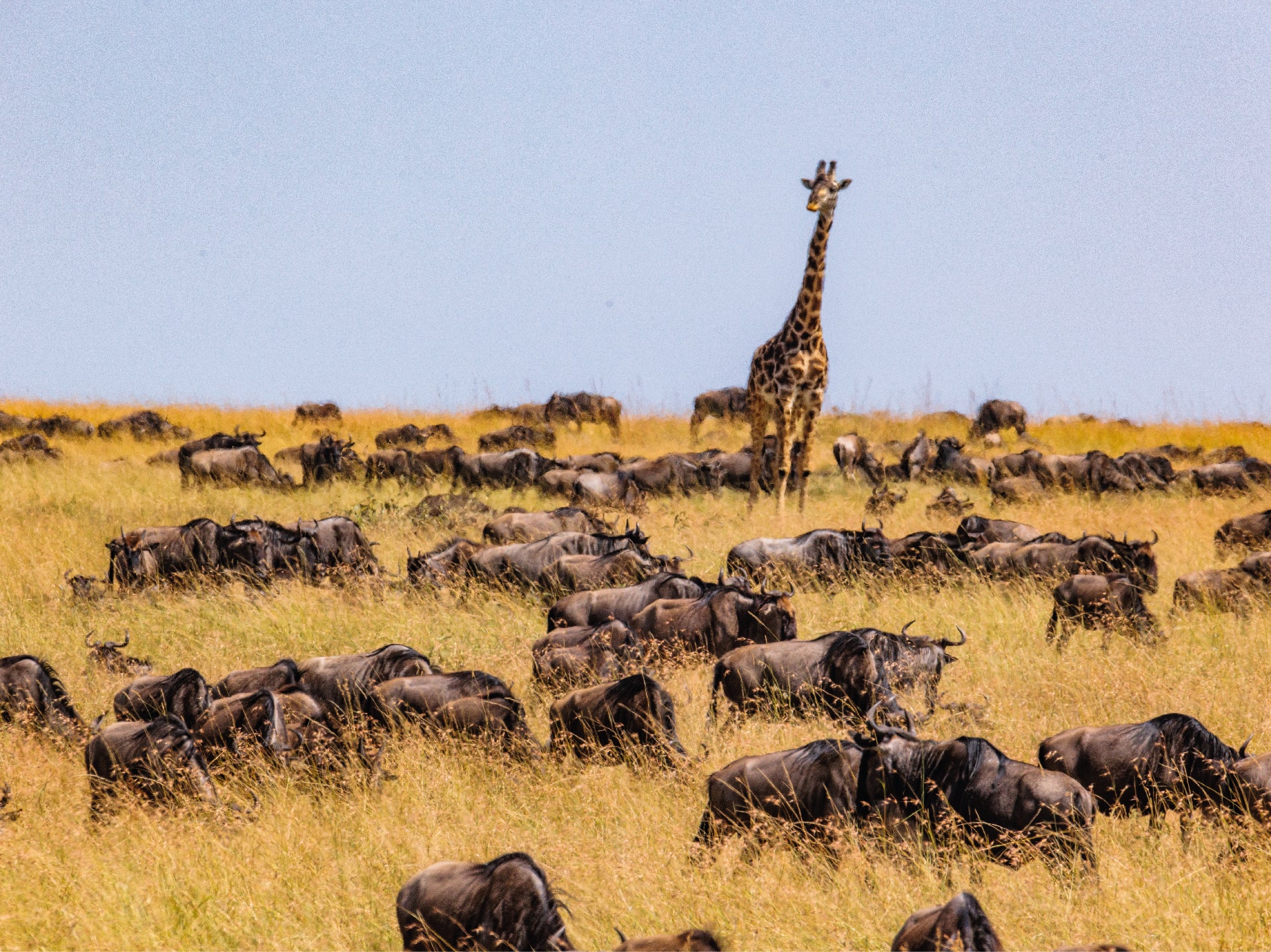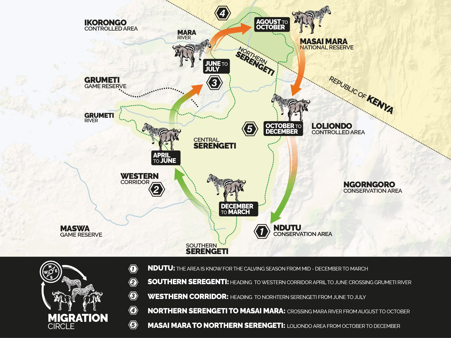 Circa due milioni di animali (per lo più gnu, zebre e gazzelle di Thomson), si muovono in massa alla ricerca di pascoli verdi, guidati dalle piogge stagionali. Ciò che rende unica questa migrazione non è solo la sua proporzione di grande rilevanza, ma anche la possibilità di osservarla in differenti fasi dell’anno, in aree diverse del parco. Ogni fase offre emozioni uniche: dalle dolci nascite nel sud alle drammatiche attraversate fluviali del nord.