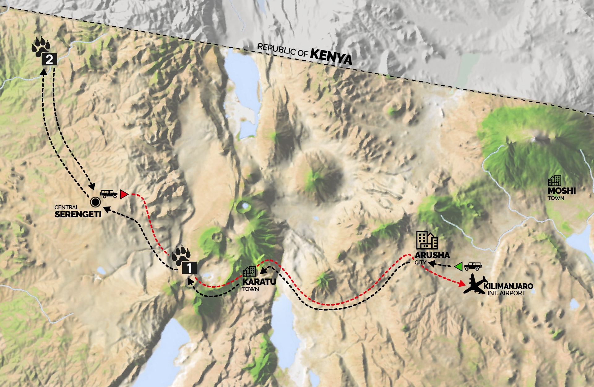 (Tempo indicativo transfer Serengeti•Arusha: 6 h • Serengeti•Aeroporto del Kilimangiaro: 7 h) Su richiesta con un costo aggiuntivo, è possibile ridurre i tempi di rientro dal safari su strada utilizzando voli interni che collegano le principali airstrip del Serengeti direttamente agli aeroporti di Arusha (ARK), Kilimangiaro (JRO) o Zanzibar (ZNZ).