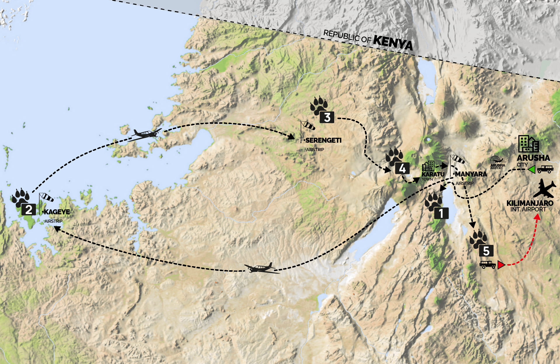 (Tempo indicativo transfer Tarangire•Arusha: 3 h • Tarangire•Aeroporto del Kilimangiaro: 4 h)