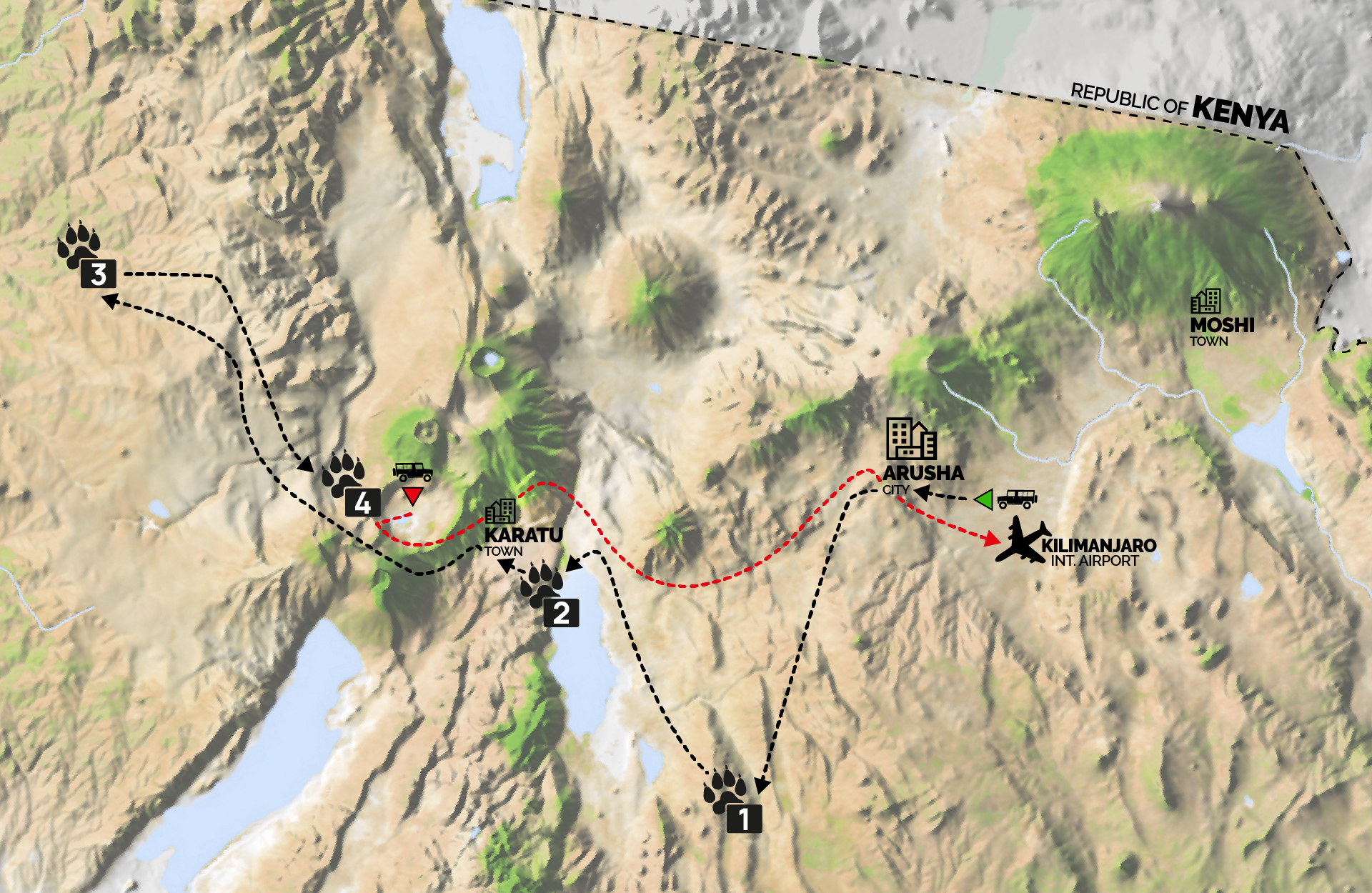(Tempo indicativo transfer Cratere di Ngorongoro•Arusha: 4 h • Arusha•Aeroporto del Kilimangiaro: 1 h)