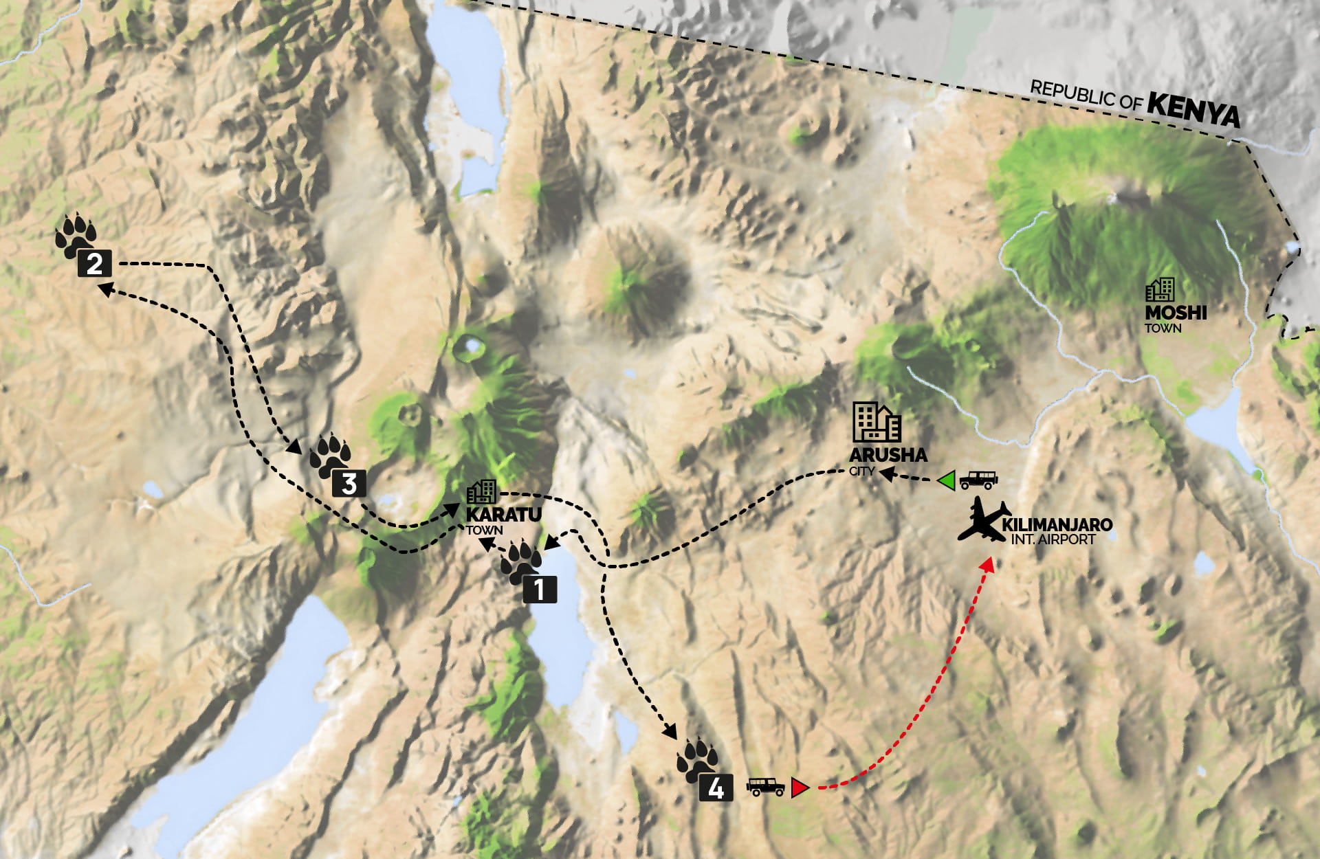 (Tempo indicativo transfer Tarangire•Arusha: 3 h • Tarangire• Aeroporto del Kilimangiaro: 4 h)
