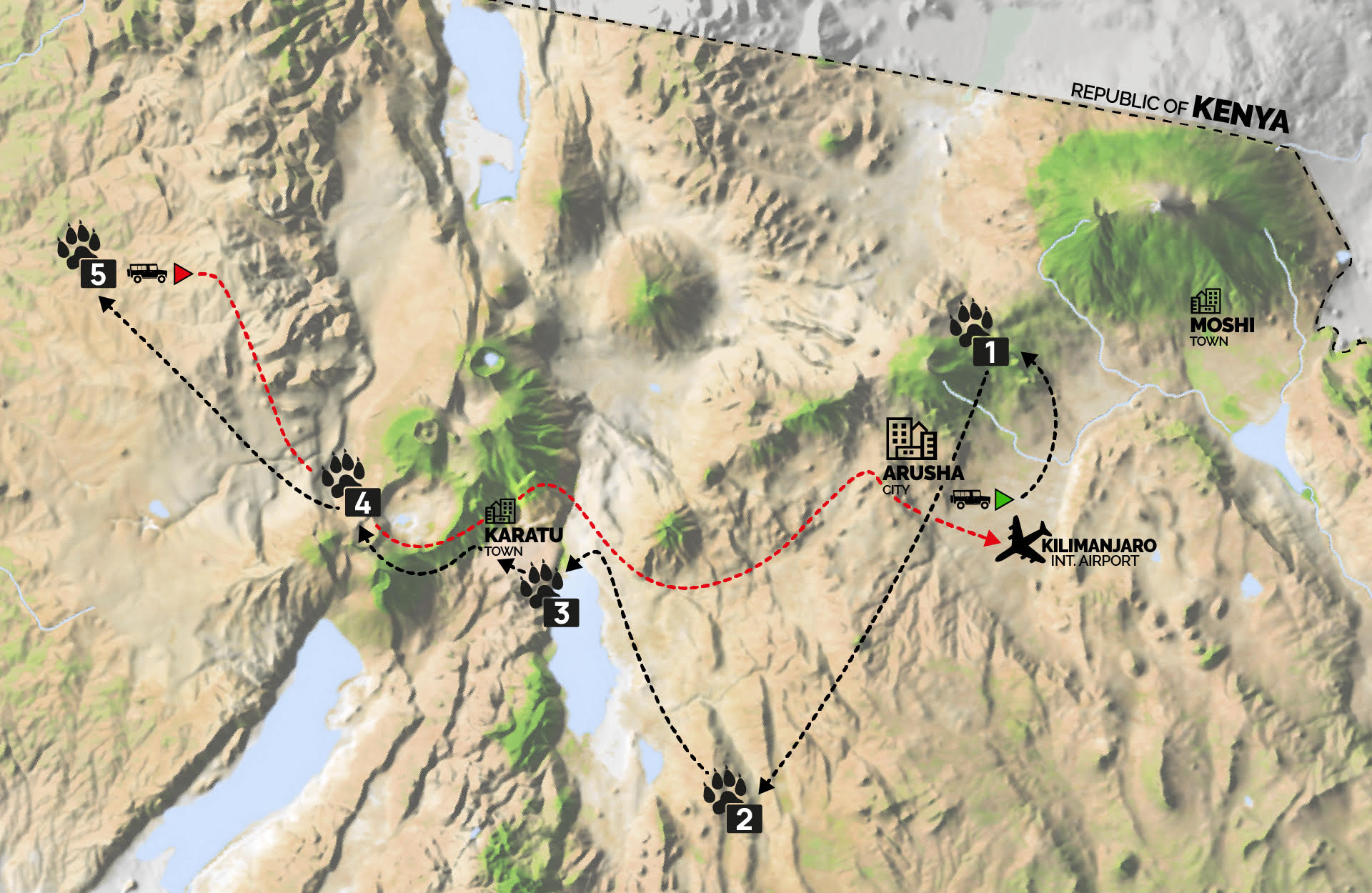 (Tempo indicativo transfer Karatu•Arusha: 2 h 30 min • Karatu•Aeroporto del Kilimangiaro: 3 h 30 min)