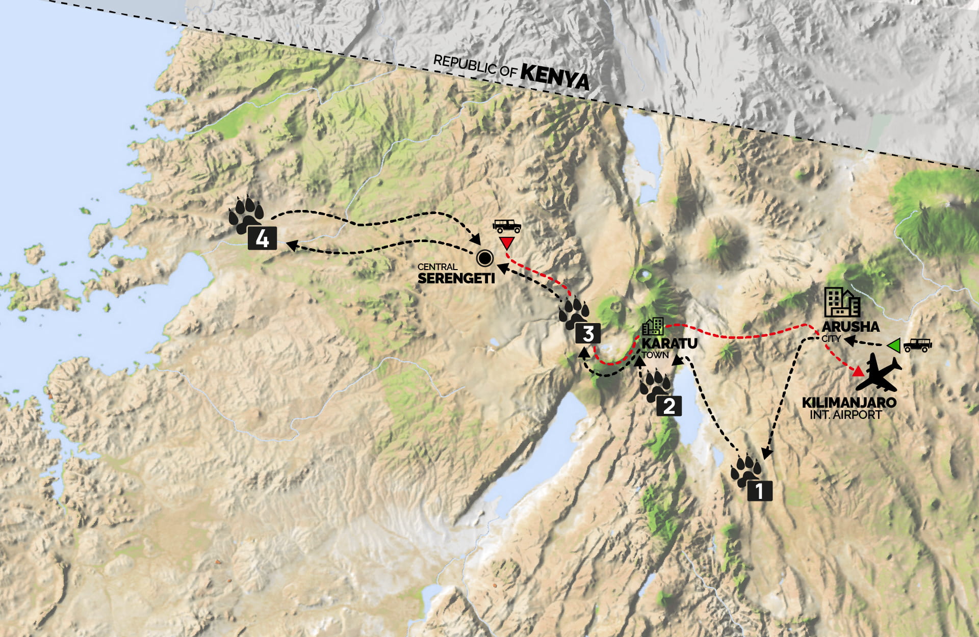 (Tempo indicativo transfer Serengeti•Arusha: 6 h • Serengeti•Aeroporto del Kilimangiaro: 7 h) Su richiesta con un costo aggiuntivo, è possibile ridurre i tempi di rientro dal safari su strada utilizzando voli interni che collegano le principali airstrip del Serengeti direttamente agli aeroporti di Arusha (ARK), Kilimangiaro (JRO) o Zanzibar (ZNZ).