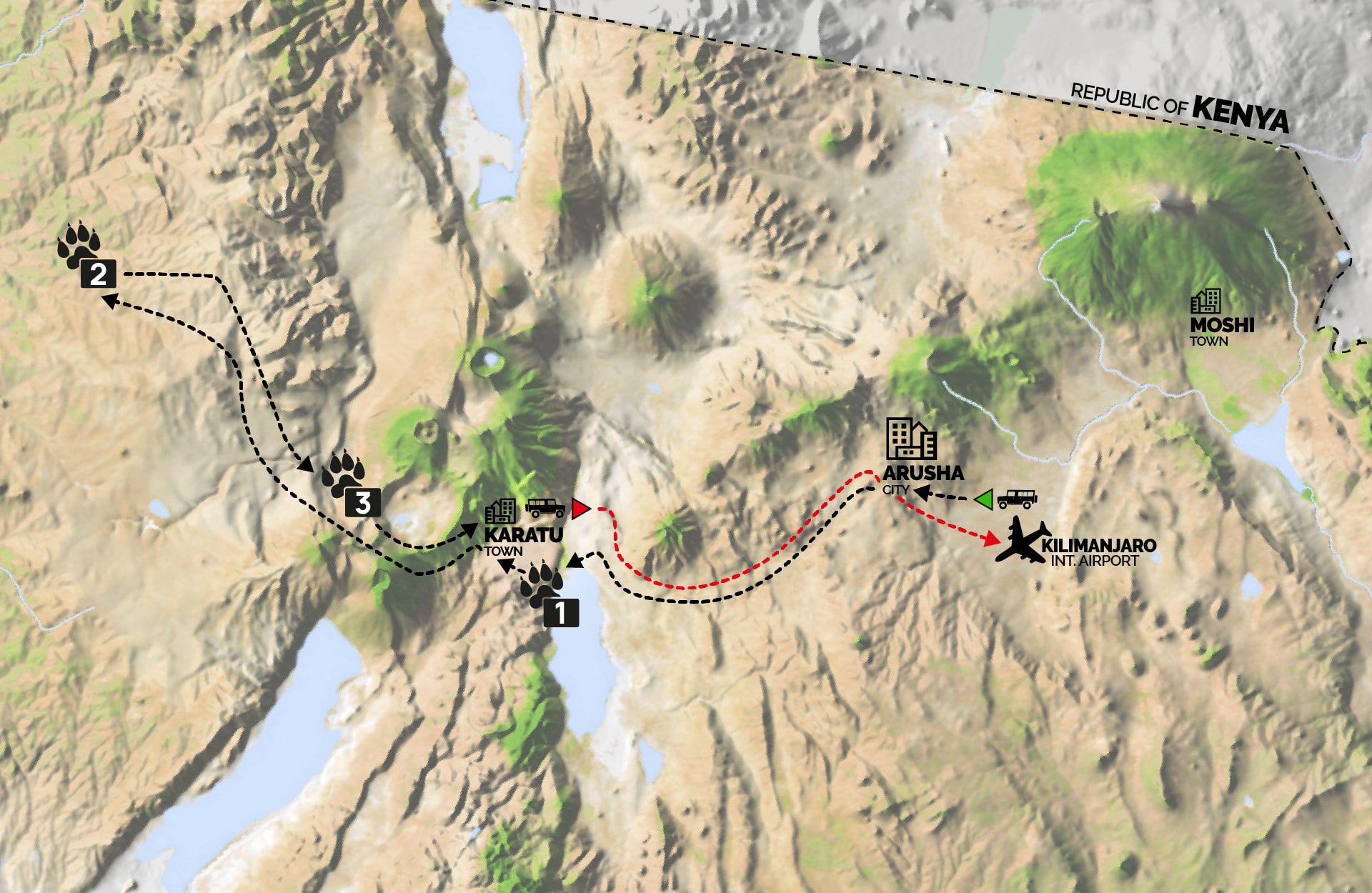 (Tempo indicativo transfer Karatu•Arusha: 2 h 30 min • Karatu•Aeroporto del Kilimangiaro: 3 h 30 min)