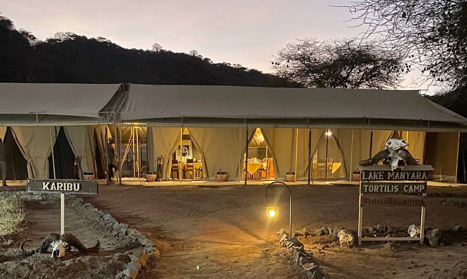 Lake Manyara Tortilis Camp è un campo tendato, situato ai piedi della scarpata della Great Rift Valley, che offre una vista privilegiata sul Lago Manyara. La struttura dispone di dieci confortevoli tende, dotate di comodi letti king-size o due letti singoli, bagno privato con doccia, wc e altri servizi essenziali.